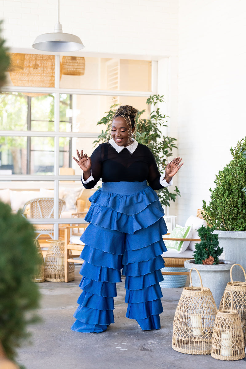 Step into effortless charm with "All My Tiers in Denim." Featuring a playful multi-tier ruffles that add personality to every move, these pants hug comfortably with a wide front band and elastic back. The zipper in the back ensures a perfect fit, making it easy to slip on for any adventure or outing. Denim never looked so fun!