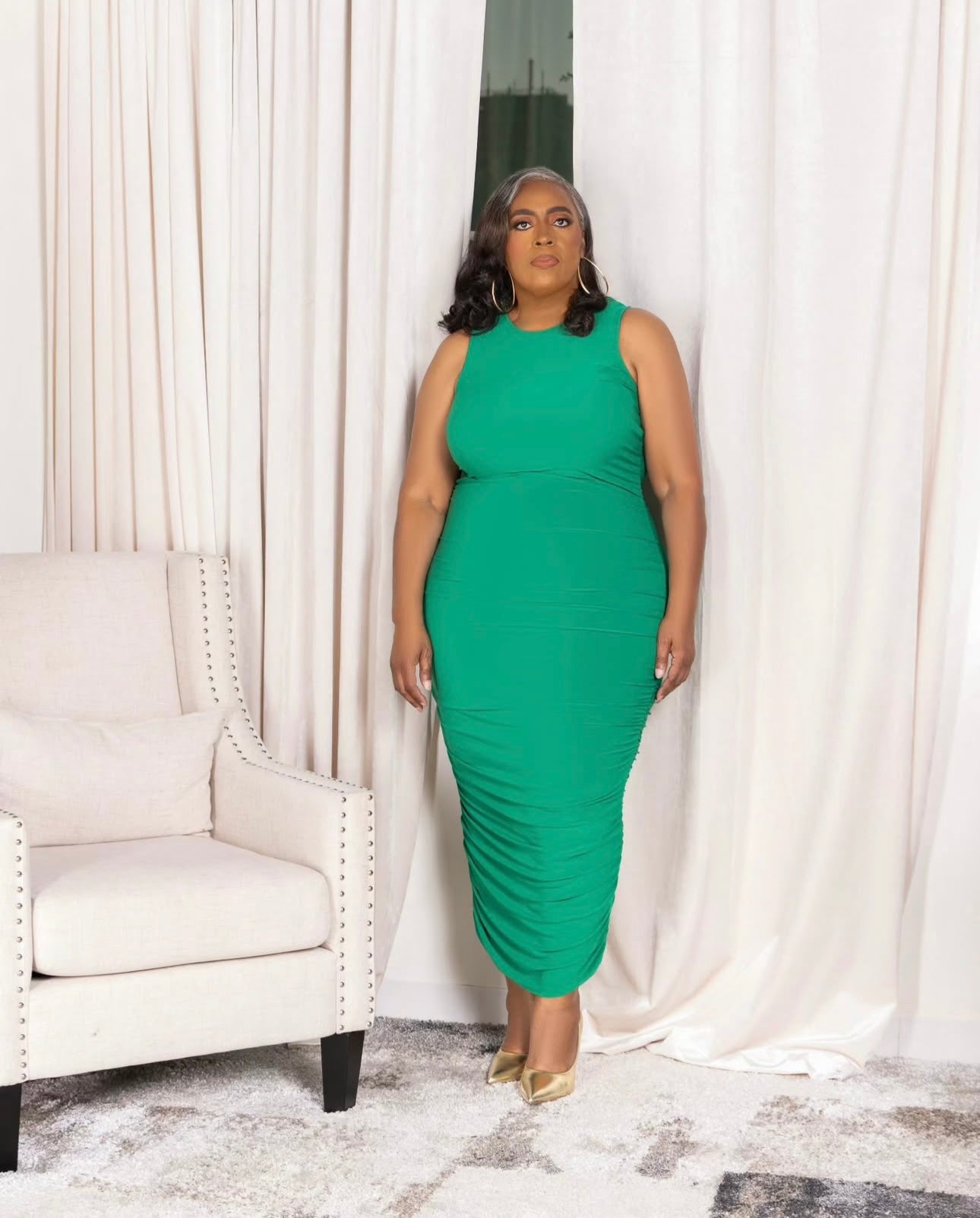 Slip into effortless elegance with this sleek green midi that's ready for your next outing. The body-hugging silhouette flatters every curve, while strategic side ruching adds dimension and visual interest. Designed without sleeves for a modern, sophisticated look, this lined piece ensures comfort and confidence from daytime to cocktail hour through late-night dancing. Perfect for date nights, celebrations, or whenever you want to feel absolutely stunning. Also available in black.