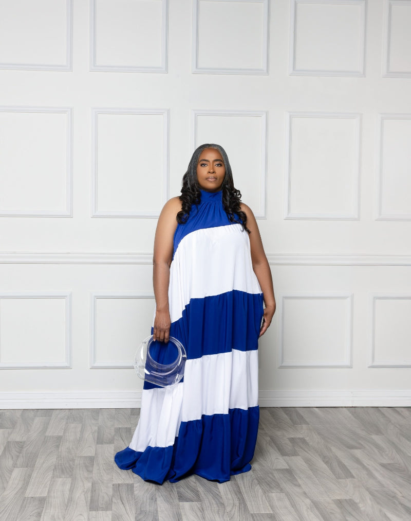 Blue and White come together to create a stylish maxi. This one is perfect for a day out or an evening stroll. Wear with cute flat or heeled sandal. Yes, you can wear the tie to the front or the back. You know how we love versatility.