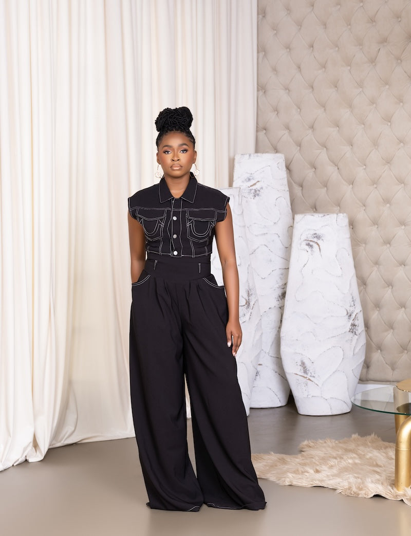 Black high waisted pants and a front button vest. Pants feature wide legs, pockets and zip in back. The 4 button vest features pockets and is etched in white stitching. Wear together or pair each separately. This is one of our favorites.