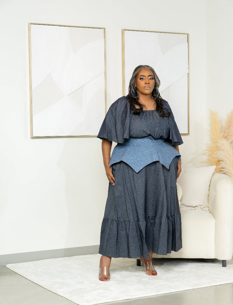 Denim 2-piece skirt set. Top can be worn on or off shoulder. Skirt has side pockets. We paired with a wide lighter denim belt (not included). Can be worn as a set or separates.