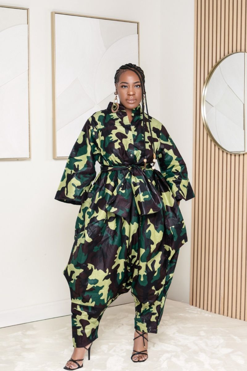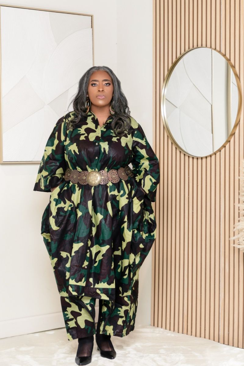 This versatile camo jumpsuit transforms into a dress. Featuring front button closure and a functional zipper at the bottom, this piece adapts to your lifestyle. The included belt cinches the waist for a customized fit, while pockets keep essentials within reach. Switch from jumpsuit to dress effortlessly; one-piece, endless styling possibilities. Perfect for those who value flexibility and contemporary design.