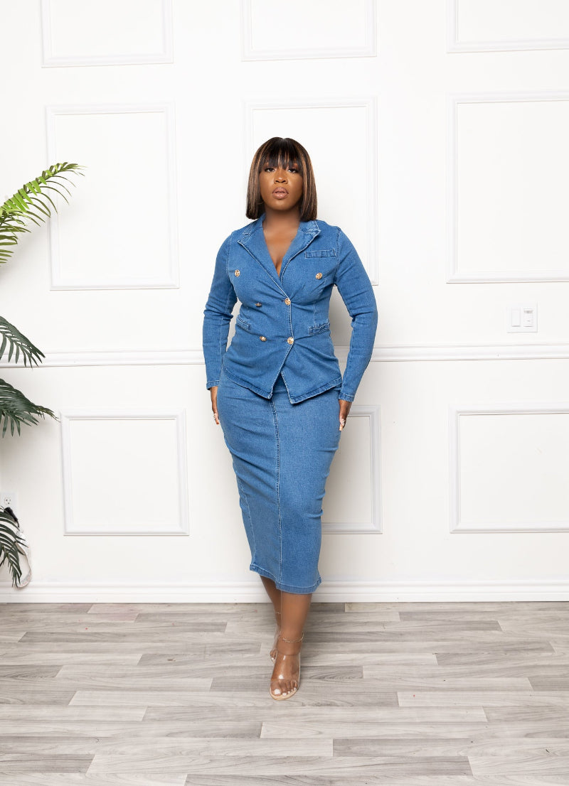 Denim 2 piece set with a double-breasted jacket. The high waisted skirt zips in back and has a slit that can be worn in front or back. You're going to love this set.