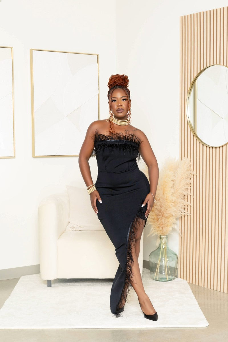 So, you like feathers but not too many. Tube dress with feathers up top and down the side. This one is meant to hug all your curves.