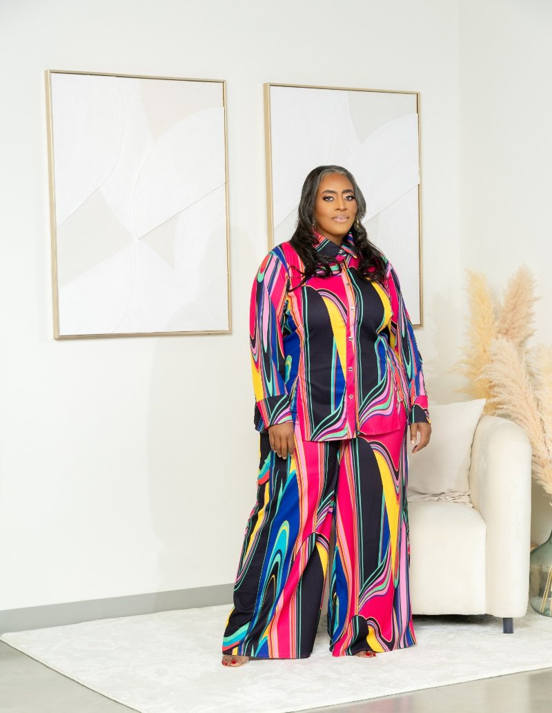 This Kaira Set is a rainbow of color. Made of a soft fabric that feels and looks good. The jacket has a single slit on each side and front buttons. The bottoms feature a high waist band, pockets and wide legs. Your wardrobe needs this suit. Also available in purple and pink/green.