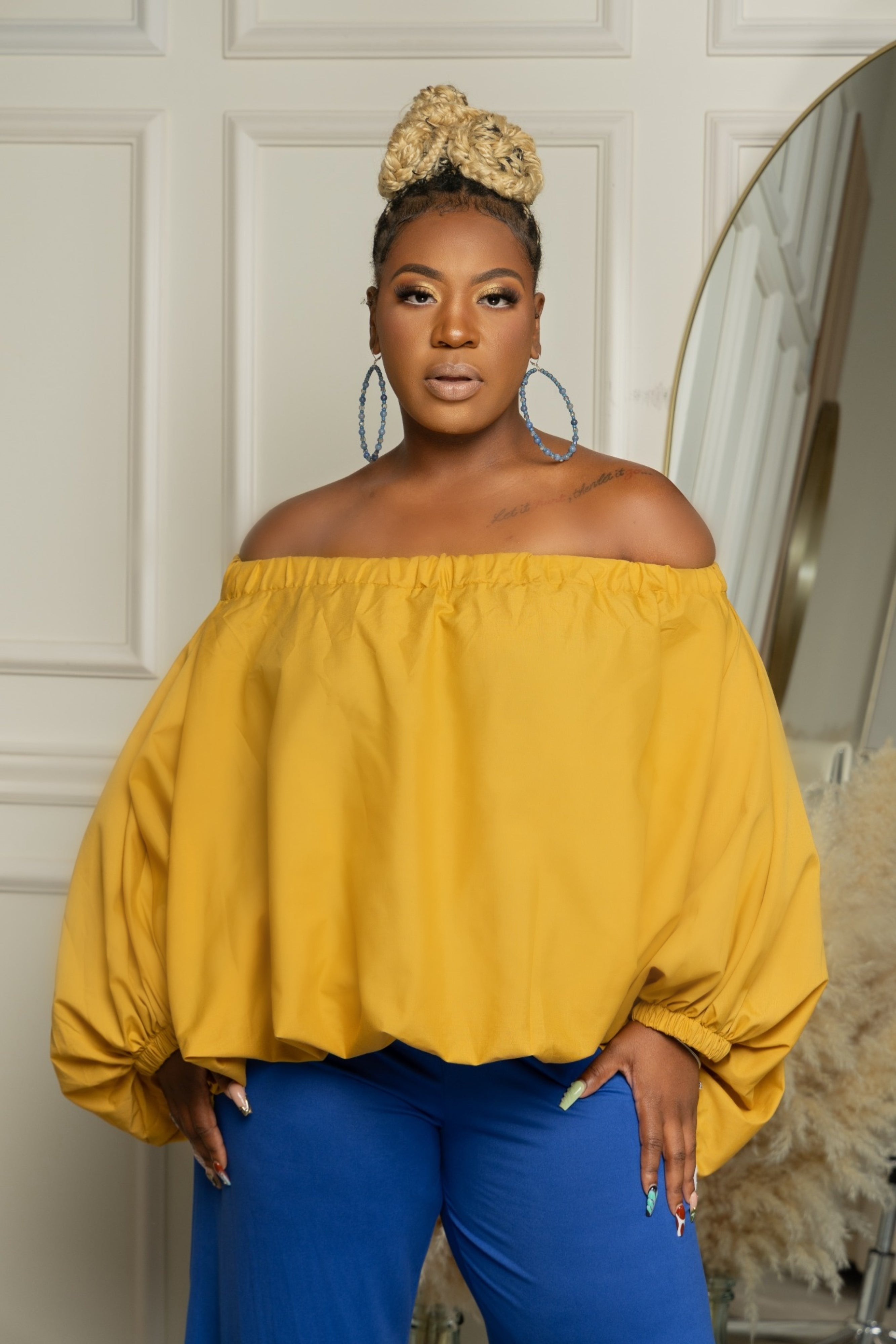 This mustard top offers an elegant, oversized fit, designed with elasticated bands at both the neckline and hem for a comfortable fit. Its generously cut sleeves create a graceful, roomy shape that balances style with ease, making it a versatile addition to any sophisticated wardrobe. One size fits most, delivering effortless chic for any occasion. Wear it on or off shoulder. We paired with the bottoms from our Yvonne Set in Blue.