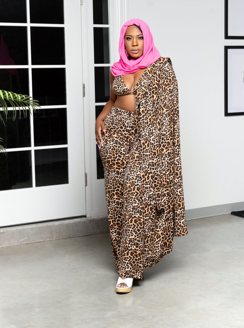 This set with 3 distinct pieces that can be mixed and matched with a variety of other pieces speaks versatility. The bold pattern of the Cheetah print commands attention and so does this ensemble. The set screams vacation, resort, beach or an evening out. Both the pants and the jacket offers pockets. The pants have an elastic waistband, and the jacket is collared and has a single snap. This combination is both daring and sophisticated, we paired with a pink scarf (not included) and a white wedge heel for just a touch of color.