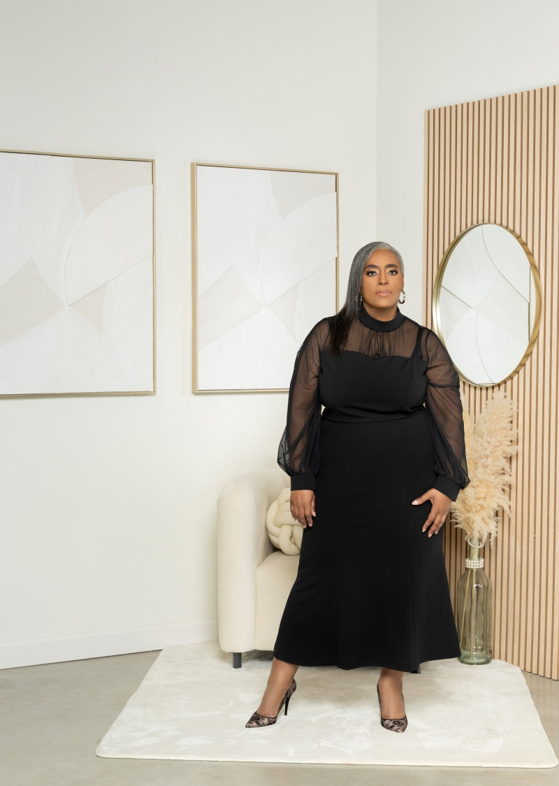 A black stretch skirt paired with a top with mesh sleeves. This stylish and versatile ensemble effortlessly transitions from day to night. The sleek, fitted silhouette of the stretch skirt accentuates the waist and elongates the legs, creating a flattering look. Whether you're aiming for a polished professional appearance or a trendy night-out look, this pairing provides a perfect balance of elegance and allure.