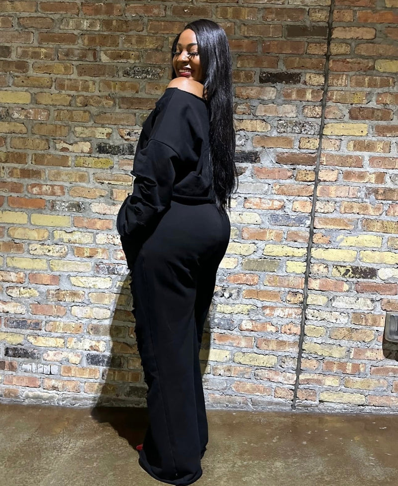 The top has distressed arms, and the bottoms have distressed legs and pockets. This one can be casual or dressy. Just depends on you. If the distress is a little much for you add black tights underneath. Top can be worn off shoulder.